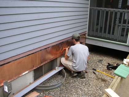 Fortunately the budget allowed me to go with good materials and hardware.  I used Grace Vycor behind the copper flashing [2].  Having read about and being aware of the corrosiveness of the new PT lumber with galvanized fasteners, I mail ordered stainless steel nails and joist hangers [3].  Due to the height of the deck, I was unable to position the ledger over the rim joist for through bolting, so I experimented with some brackets that bolt to the foundation [3].
