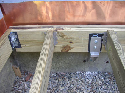 Last year I got a permit for this deck…this past August I finally got around to building it. For my parents, the purpose was to have a platform at about the level of the porch for the grill to be on making it easier to bring food in and out. It also creates a great place to eat breakfast (in the sun) or lunch in warm weather. For me, I wanted a new challenge. A few years back I rebuilt a 12’x12’ deck with the help of my Papou for two of his cousins. For this project, I wanted to do something a little different. Having read about decks with radiuses in a couple of magazines, I knew that’s what I wanted. I had been dying to try it out for myself, and finally got a chance. Fortunately the budget allowed me to go with good materials and hardware. I used Grace Vycor behind the copper flashing [2]. Having read about and being aware of the corrosiveness of the new PT lumber with galvanized fasteners, I mail ordered stainless steel nails and joist hangers [3]. Due to the height of the deck, I was unable to position the ledger over the rim joist for through bolting, so I experimented with some brackets that bolt to the foundation [3]. The deck is roughly 12’x12’ with a five foot radius on one corner. We went with Timbertek composite decking (I did online research and checked with local suppliers), and Azek for the face board and risers on the stairs. All was fastened with stainless steel screws. This project was another great experience, “fun,” and best of all the deck came out looking great. |