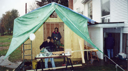 For my Eagle project I designed and built a storage shed for a church in my town; this was my first large-scale project. Playing the role of foreman and not getting involved in the work myself proved to be very difficult (in fact, it was impossible). In photo number four, is Roger Conant, the first Eagle Scout of Troop One Littleton (1927), presenting a sign to me that he made. He had stopped by several times to see how I was doing. He also donated money, paying for all the hardware. I enjoyed every bit of the project, but my favorite aspect is the turning of pencil lines on paper into a reality. This is true for all of my projects. Before construction began I met with the Church Property Committee, to talk about the design of the shed. I also brought a model along to display the size and appearance. One of the members wanted the floor to be 3/4 inch pressure treated plywood. We also discussed color, whether or not they wanted windows, and the type of lock. Next I finalized the bill of materials and went to G.V. Moore Lumber Co., to get a quote. I met with the owner Calvin Moore, who agreed to help me out by taking $200 off the total cost of materials, and donating $100 himself. I gained a great deal of knowledge, including how to properly set up and use a transit [2]. One of my most memorable times on the project was the day we worked in the pouring rainfor nine hours [3]. We didn’t have lighting, so we had to stop once the sun said goodnight. |