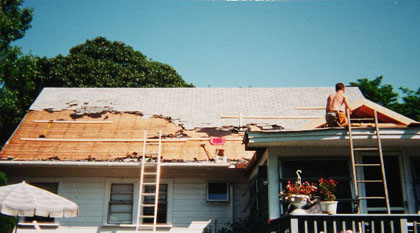 The flat roof of my Papou’s and late Nana’s porch was leaking, so I sketched up several variations of a possible design. All designs were based around a gable roof, which would increase the ceiling height from six feet six inches, to eight feet six inches. My Papou and other family members readily agreed to my proposal. My project consisted of removing a flat roof covering a 12’x16’ porch (off the rear corner of the cape), erecting a new roof with a 6/12 pitch, removing three layers of shingles from the back of the house, and topping it off was shingling my new roof and re-shingling the house roof. If you look at photo three, you’ll see a water bottle. At the end of the project, it was declared MIA, and has yet to be found. The project almost came to a halt due to adverse weather conditions half way through. My Papou (grandfather) deemed it was too hot and humid to work safely as did my mother (upper 90’s with high humidity). Did I mention I did all the interior finish work and the installation of two fans including the electrical wiring? I acted as project manager and master carpenter, electrician and foreman. Thanks to this project I have also experienced my first callback, and I haven’t even worked for a business yet. Labor day weekend (2003) I had to fix the shingling of one of the valleys that was done incorrectly (oops!). Well, what can I say, it was my first time, and I had never seen it done before, just seen the finished product on completed houses. Hey, it’s good to learn from experience, callbacks or not.